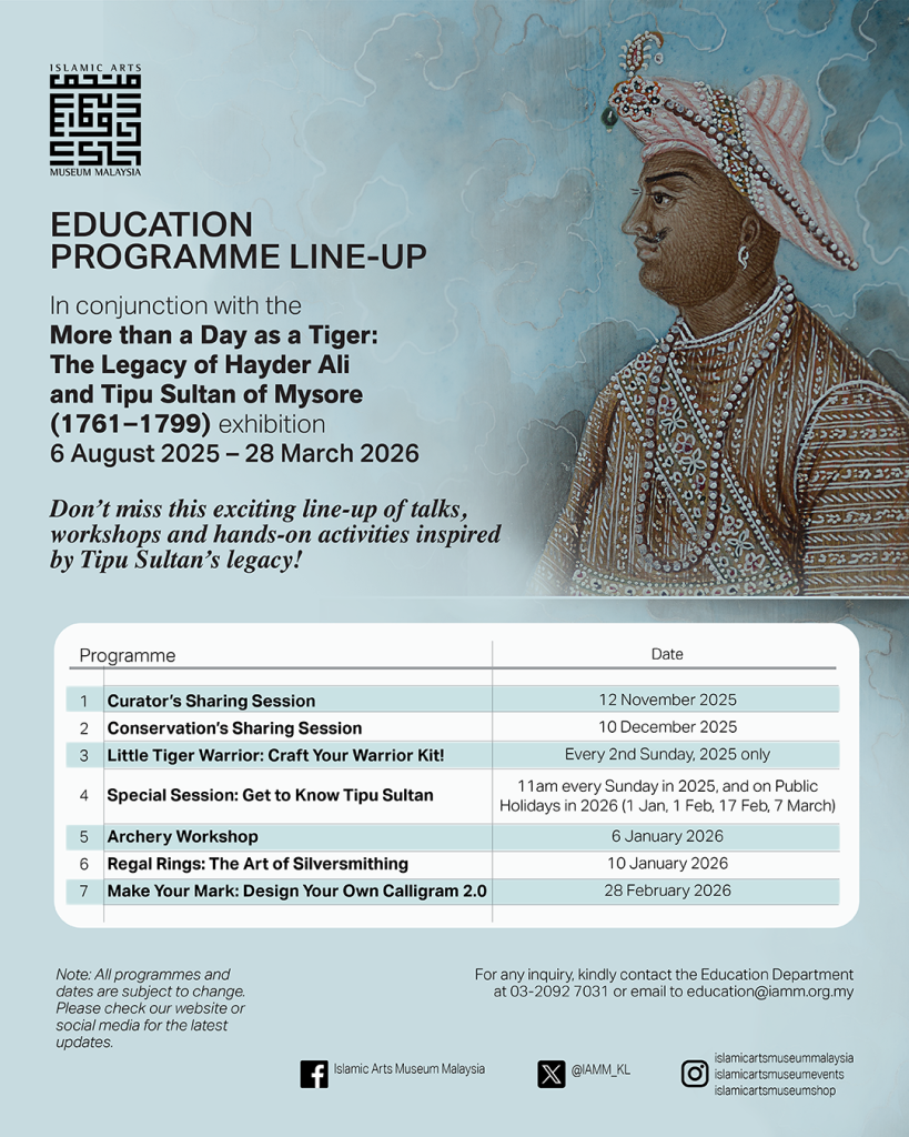 In conjunction with the "More than A Day as a Tiger: The Legacy of Hayder Ali and Tipu Sultan of Mysore (1761-1799)" exhibition, we offers an inspiring journey into the rich history, resistance, and legacy of Mysore under their leadership. Participants will explore key artefacts, stories of diplomacy and warfare, and the cultural significance of their reign, enriching their understanding of South Asian heritage through curated experiences and guided discussions.