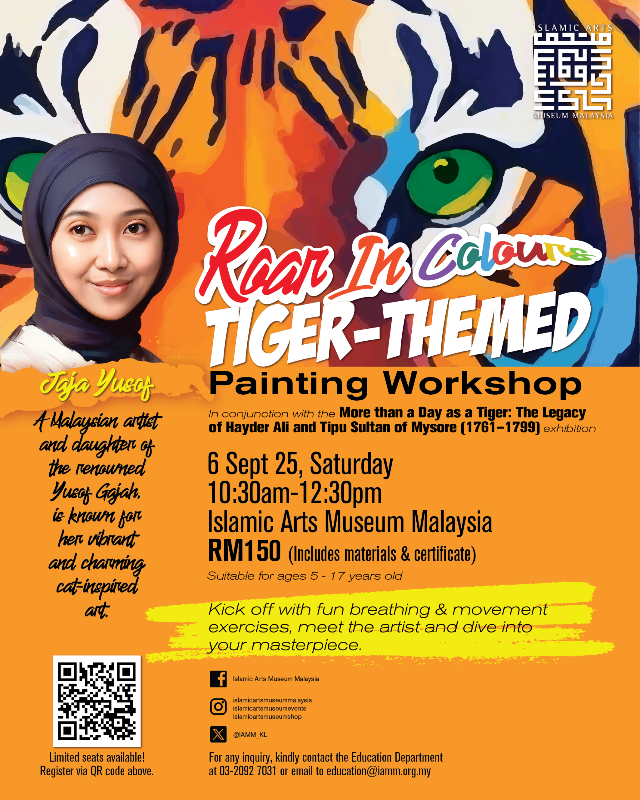 In conjunction with More than a Day as a Tiger: The Legacy of Haider Ali and Tipu Sultan of Mysore (1761–1799), the Islamic Arts Museum Malaysia is pleased to present a special tiger-themed painting session inspired by the enduring legacy of Tipu Sultan. This event offers participants an opportunity to explore artistic expression through the lens of historical and cultural significance.